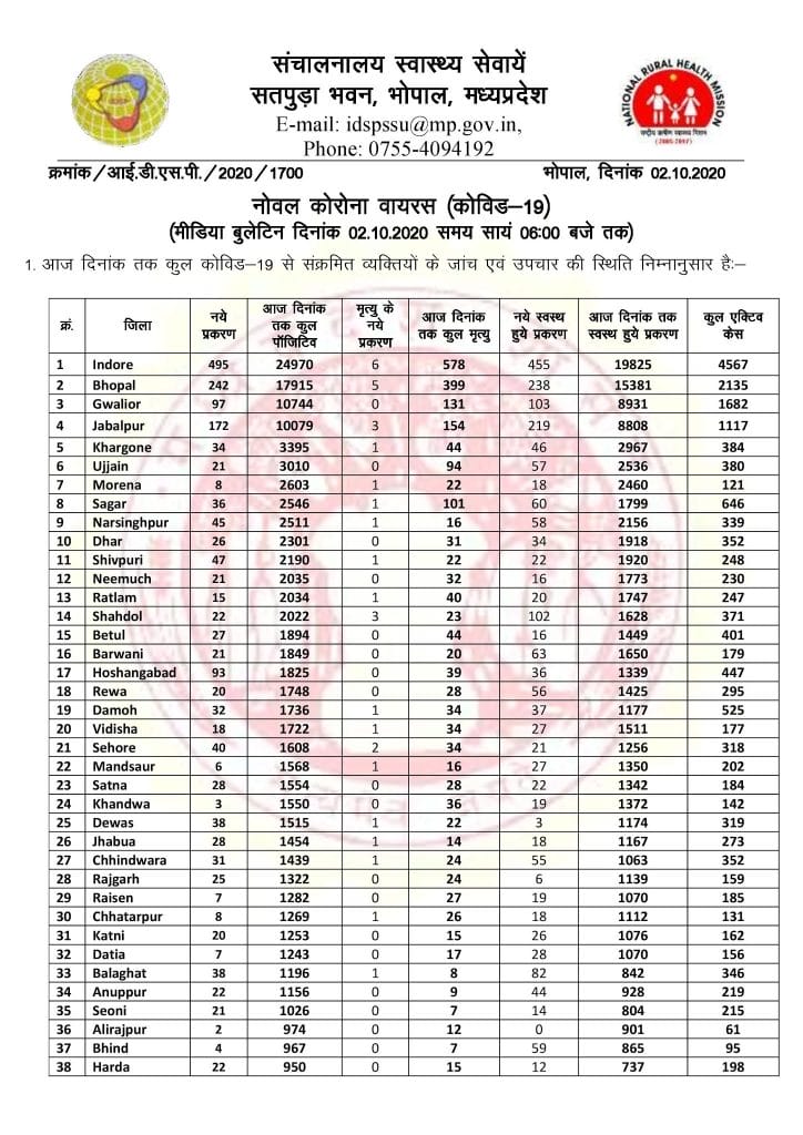 प्रदेशभर में पिछले 24 घंटे में 2332 कोरोना मरीज स्वस्थ हुए हैं। वहीं आज 36 कोरोना मरीजों की उपचार के दौरान मौत हो गई। प्रदेश में अब तक 2,372 मरीजों की कोरोना से मौत हो चुकी है। प्रदेश में अब तक 1 लाख 9 हजार 611 मरीज स्वस्थ हो चुके हैं| इंदौर में सर्वाधिक 495 नए केस मिले हैं, वहीं भोपाल में 242 ग्वालियर में 97 और जबलपुर में 172 नए मरीज सामने आये हैं|