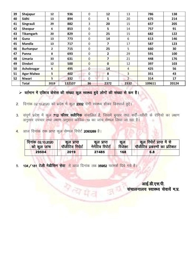 संचालनालय स्वास्थ्य सेवाएं, मध्य प्रदेश द्वारा जारी कोरोनावायरस मीडिया बुलेटिन के मुताबिक पिछले 24 घंटे में 29504 सैंपल की जांच की गई। जिसमे से 168 सैंपल रिजेक्ट हो गए। वहीं 27485 सैंपल नेगेटिव और 2019 सैंपल पॉजिटिव पाए गए। प्रदेश में कुल संक्रमितों की संख्या बढ़कर 1 लाख 32 हजार 107 हो गई।