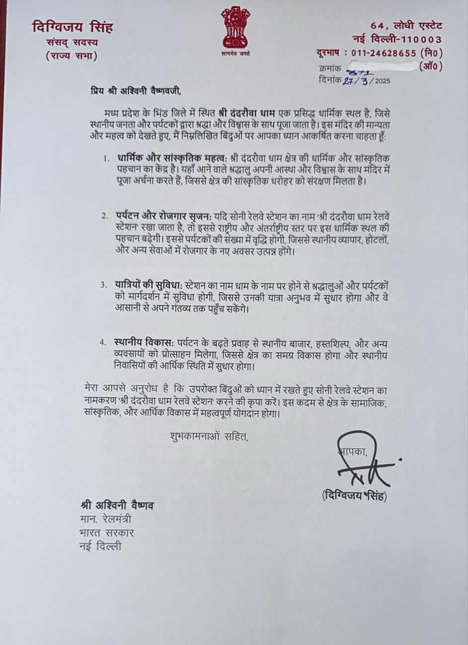 दिग्विजय सिंह ने लिखा रेल मंत्री को लिखे पत्र में कहा, मध्य प्रदेश के भिंड जिले में स्थित श्री दंदरौआ धाम एक प्रसिद्ध धार्मिक स्थल है, जिसे स्थानीय जनता और पर्यटकों द्वारा श्रद्धा और विश्वास के साथ पूजा जाता है। इस मंदिर की मान्यता और महत्व को देखते हुए मैं चाहता हूँ कि आप इसके नजदीक स्थित सोनी स्टेशन का नाम “श्री दंदरौआ धाम रेलवे स्टेशन” कर दें तो इस कदम से क्षेत्र के सामाजिक, सांस्कृतिक, और आर्थिक विकास में महत्वपूर्ण योगदान होगा।