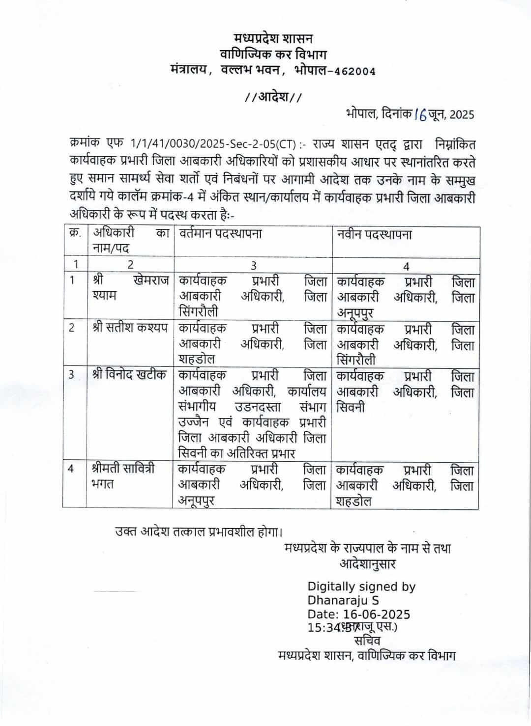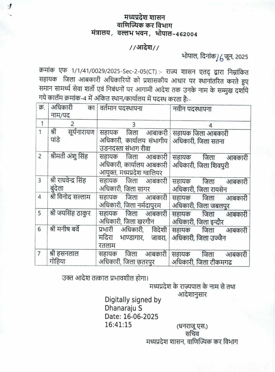 वाणिज्यिक कर विभाग द्वारा जारी सूची में सहायक जिला आबकारी अधिकारी, कार्यवाहक जिला आबकारी अधिकारी के नाम शामिल हैं जिनको ट्रांसफर कर एक जिले से दूसरी जगह पदस्थ किया है, आदेश में कहा गया है कि तबादला आदेश तत्काल प्रभाव से लागू होगा।