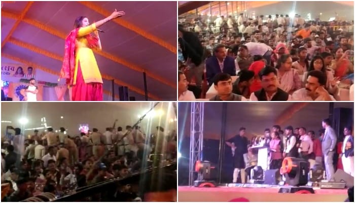 दरअसल शुक्रवार को दमोह जिले के पथरिया में चल रहे बुन्देली मेला में सपना चौधरी का डांस प्रोग्राम था। सपना को देखने करीब एक लाख के आसपास लोग आए थे।इस दौरान जैसे ही कार्यक्रम शुरु हुआ भीड़ बेकाबू हो गई ।कई कुर्सियों पर चढ़ गए तो कई लोग वही सीटियां बजाकर जमकर हंगामा करने लगे।।स्थिति ये हो गई कि कई बार कार्यक्रम को बीच मे रोका गया ।पुलिसकर्मी भीड़ को लगातार समझाइश देते रहे । खुद सपना चौधरी ने भी लोगों से नीचे उतरने का निवेदन किया।