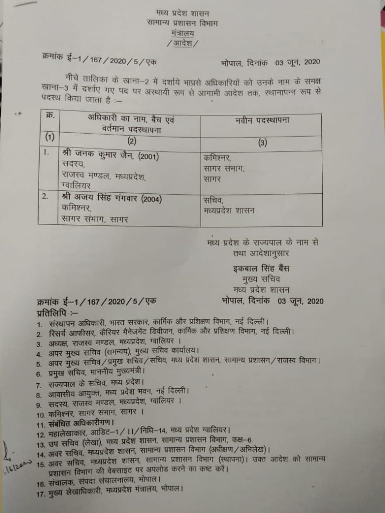 भोपाल| मध्य प्रदेश (Madhya Pradesh) में प्रशासनिक फेरबदल का दौर जारी है| सरकार (Government) ने अब सागर कमिश्नर (Sagar Commissioner) को हटा दिया है| सामान्य प्रशासन विभाग ने बुधवार को इस संबंध में आदेश जारी किया है| राजस्व मंडल ग्वालियर में पदस्थ जेके जैन अब सागर संभाग के कमिश्रर होंगे। 2001 बैच के आईएएस जेके जैन राजस्व मंडल ग्वालियर में सदस्य थे। वहीं सागर संभाग के कमिश्रर अजय सिंह गंगवार को मप्र शासन में सचिव बनाया गया है।