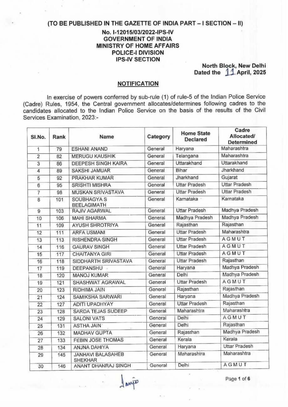 IPS Officer Cadre Allotment: सिविल सर्विसेस एक्जाम 2023 में भारतीय पुलिस सेवा के लिए चयनित प्रतिभागियों को गृह मंत्रालय ने कैडर अलॉट कर दिए हैं, मंत्रालय ने 200 IPS अधिकारियों के कैडर अलॉटमेंट का नोटिफिकेशन  जारी किया है, इसमें मध्य प्रदेश को 13 आइपीएस अधिकारी मिले हैं इसमें से 5 को होम कैडर अलॉट हुआ है।