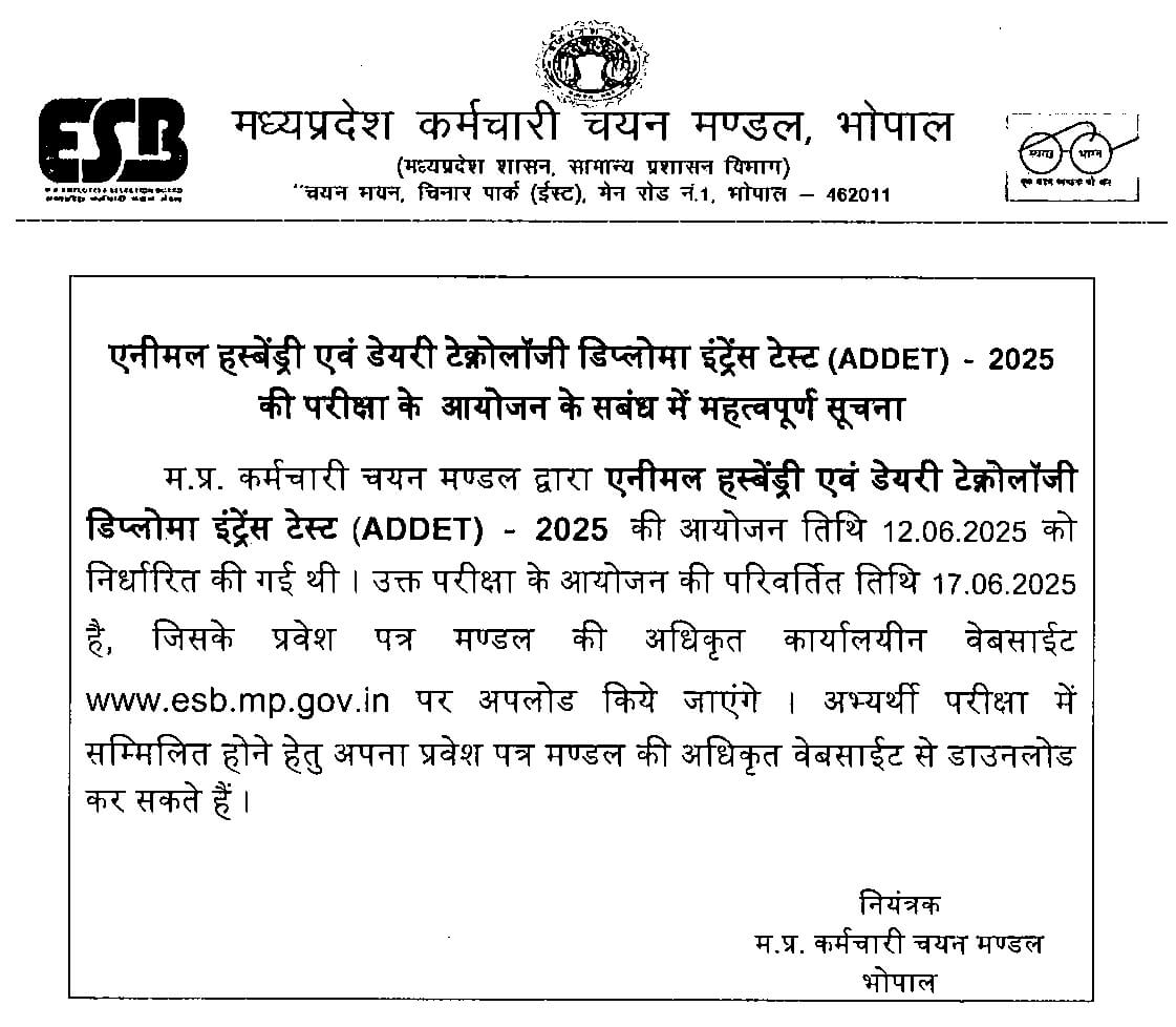 Madhya Pradesh employees selection board Bhopal ने पशुपालन और डेयरी प्रौद्योगिकी डिप्लोमा कोर्स में एडमिशन के लिए प्रवेश परीक्षा की तारीख बदल दी है। उल्लेखनीय है कि इस परीक्षा का आयोजन 12 जून 2025 को किया जाना था लेकिन परीक्षा के सिर्फ दो दिन पहले आज 10 जून को MPESB भोपाल ने एक नोटिस जारी कर परीक्षा की तारीख बदल दी।