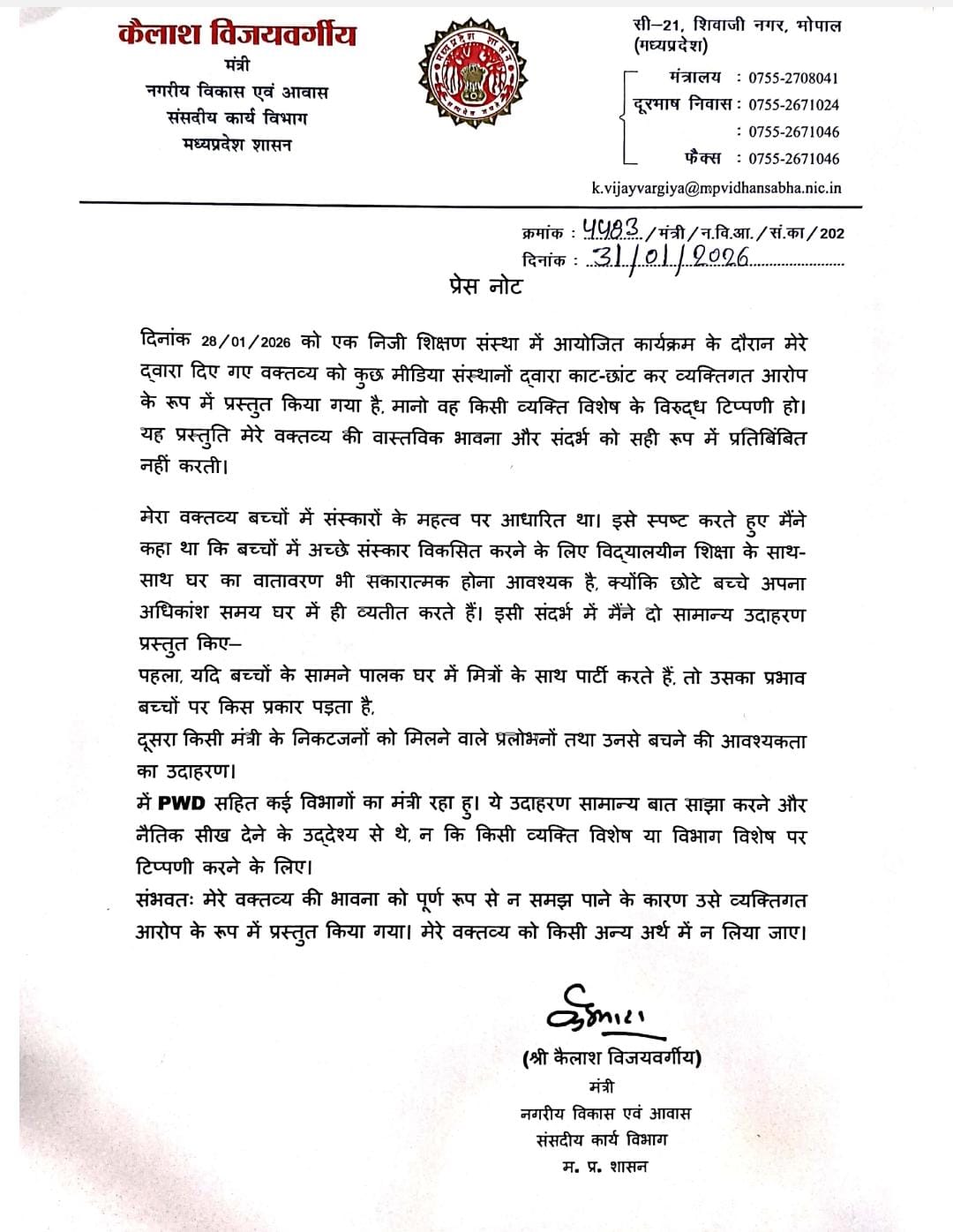 विवाद को बढ़ता देख मंत्री कैलाश विजयवर्गीय ने एक प्रेस नोट जारी कर स्थिति स्पष्ट की। उन्होंने कहा, “मेरे वक्तव्य को कुछ मीडिया संस्थानों द्वारा काट-छांट कर ऐसे प्रस्तुत किया गया, मानो वह किसी व्यक्ति विशेष या विभाग विशेष पर कोई टिप्पणी हो।”
