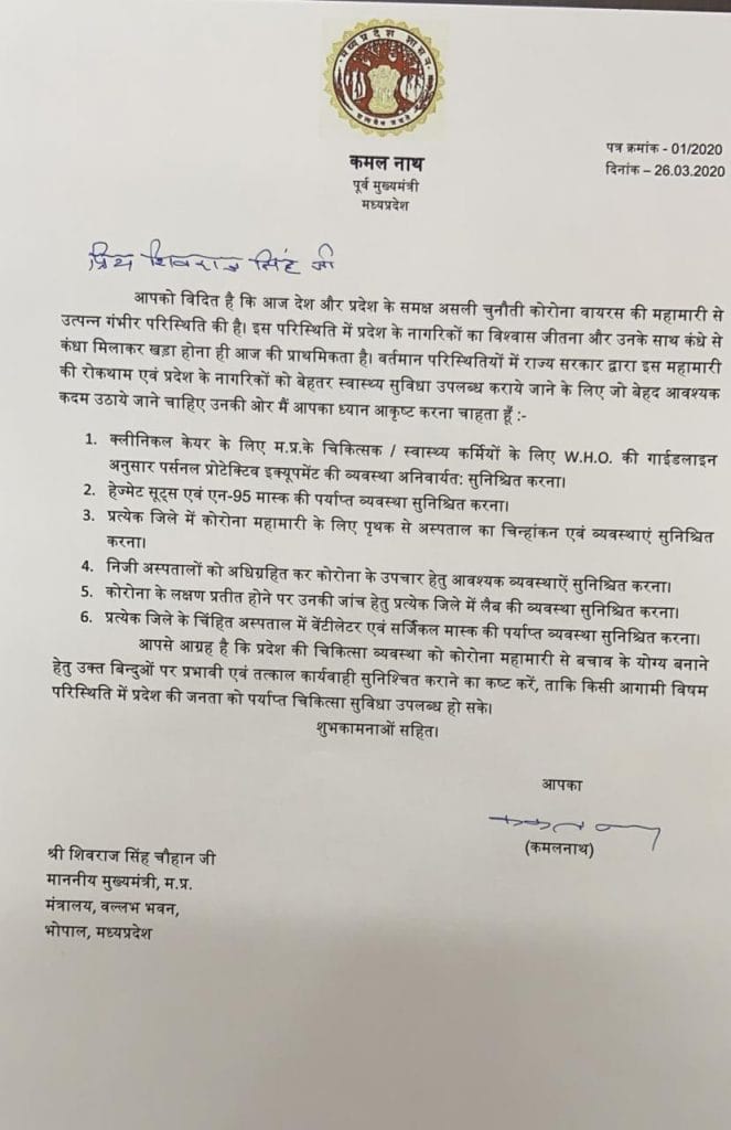 कमलनाथ ने सीएम शिवराज को पत्र में बेहतर स्वास्थ्य सुविधाएं मुहैया कराने के लिये सलाह दी है। उन्होने लिखा है कि क्लिनिकल केयर के लिये WHO की गाइडलाइन के मुताबिक स्वास्थ्यकर्मियों के लिये पर्सनल प्रोटेक्टिव इक्यूपमेंट की व्यवस्था सुनिश्चित की जाए। हेज्मेट सूट्स और एन-95 मास्क की व्यवस्था की जाए। हर जिले में कोरोना के लिये अलग से अस्पताल चिन्हित किये जाएं तथा निजी अस्पतालों को अधिगृहित कर वहां भी कोरोना का इलाज करने की व्यवस्था की जाए।