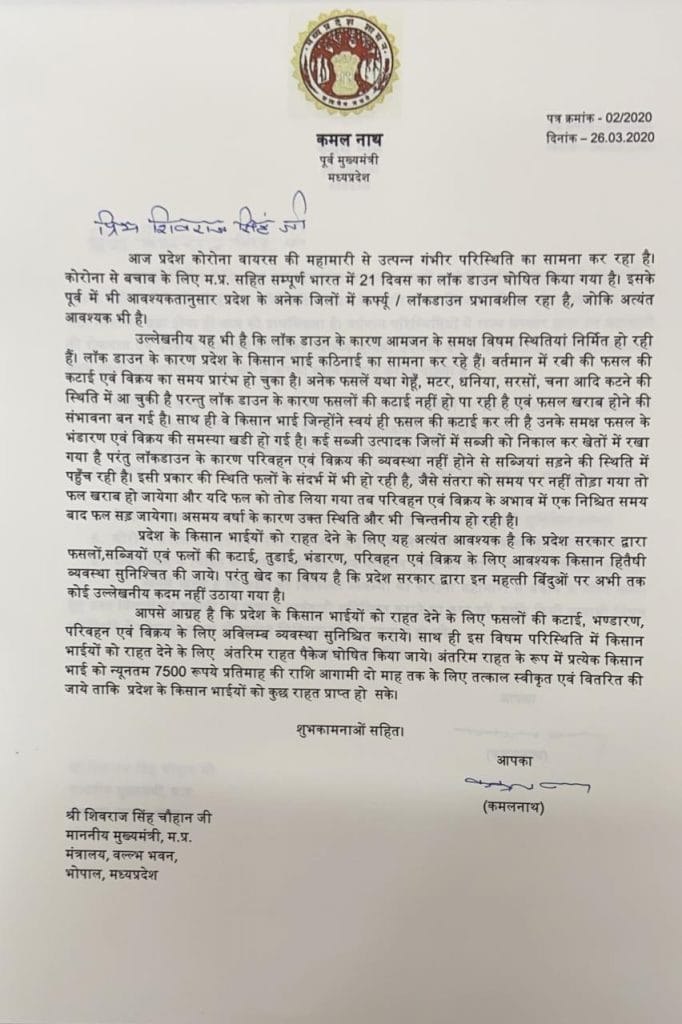 कमलनाथ ने सीएम को लिखे एक अन्य पत्र में इस आपदा की घड़ी मे किसानो को हो रहे नुकसान तथा उनकी सहायता के लिये भी अपील की है। उन्होने कहा है कि प्रदेश सरकार द्वारा किसानों के लिये फसलों की कटाई, भंडारण, परिवहन एवं विक्रय के लिये व्यवस्था की जाए, ताकि इस संकट के समय उनकी साल भर की मेहनत नष्ट न हो।