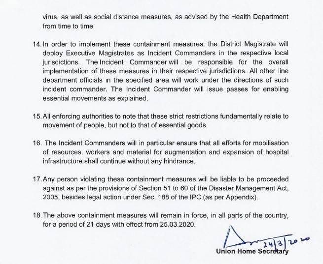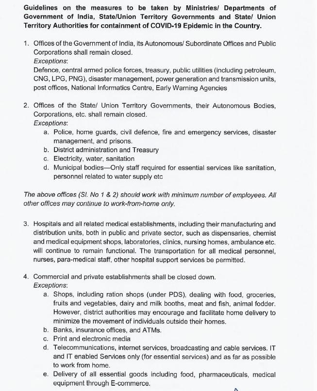प्रिंट व इलेक्ट्रॉनिक मीडिया इससे मुक्त है। सभी धार्मिक स्थल पूर्णत बंद रहेंगे। सामाजिक, राजनीतिक, खेल से जुड़े हुए, पढ़ाई लिखाई से जुड़े कोई भी लोग एक जगह पर एकत्रित नहीं होंगे ।अंतिम संस्कार में भी 30 से ज्यादा लोग उपस्थित नहीं हो सकेंगे। 15 फरवरी के बाद भारत पहुंचे हर व्यक्ति को होम कोरोन्टाइन रहना होगा नहीं तो उसके खिलाफ धारा 188 के खिलाफ कार्रवाई की जाएगी। आईटी जैसी चीजों से जुड़े हुए व्यक्तियों से कहा गया है कि वे वर्क फ्रॉम होम करें । सभी उद्योगों को बंद कर दिया गया है सिवाय उनके जहां अत्यावश्यक सेवाओं का उत्पादन होता है।