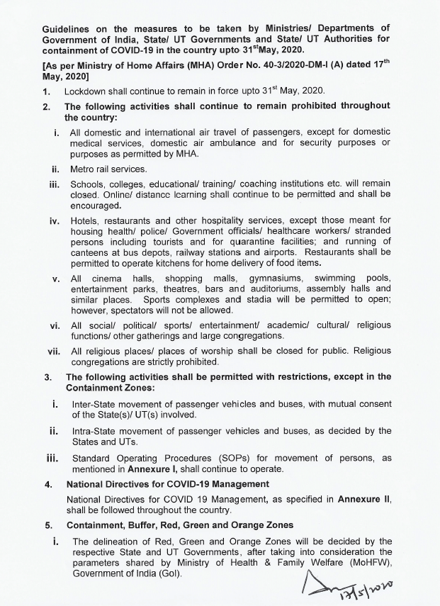 चिकित्सा में सहयोग करने वाले होटल के अलावा सभी होटल और रेस्तरां बंद रहेंगे. हालांकि होम डिलिवरी की सुविधा दी जा सकती है| 31 मई तक देशभर में जिम, सिनेमा हॉल, शॉपिंग मॉल, स्विमिंग पूल, एंटरटेनमेंट पार्क, थियटर, बार और सभागार बंद रहेंगे| स्कूल, कॉलेज और कोचिंग भी बंद रहेंगी| इस अवधि में सभी सामाजिक, राजनीतिक, धार्मिक कार्यक्रमों पर रोक रहेगी साथ ही सभी प्रार्थना और धार्मिक स्थल बंद रहेंगे| राज्यों की परस्पर सहमति से अंतरराज्यीय यात्री वाहनों, बस सेवाओं की आवाजाही को अनुमति दी जा सकती है|