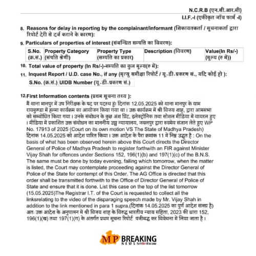 Madhya Pradesh High Court News : मंत्री कुंवर विजय शाह मामले में मध्य प्रदेश हाई कोर्ट ने दर्ज FIR पर सवाल उठाते हुए पुलिस को इसे रिप्रोड्यूस करने के निर्देश दिए हैं। कोर्ट ने FIR के पैराग्राफ 12 को लेकर सवाल खड़े किए हैं। हाई कोर्ट ने यहां तक कहा है कि यदि इस एफआईआर को चुनौती दी जाए तो यह आसानी से रद्द हो सकती है।