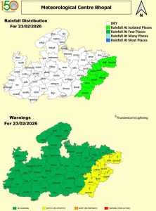 मौसम विभाग (IMD) ने सीधी, सिंगरौली, शहडोल, उमरिया, सिवनी, अनूपपुर, मंडला, डिंडौरी और बालाघाट जिलों में हल्की बारिश की संभावना जताई गई है। यह चौथा मौका होगा जब 23 फरवरी से फिर कुछ क्षेत्रों में वर्षा की संभावना जताई गई है। इससे पहले 18 फरवरी से तीसरा दौर शुरू था, जिसका असर 19, 20 और 21 फरवरी तक रहा। वहीं फरवरी के पहले दूसरे हफ्ते में दो दौर देखने को मिले थे।