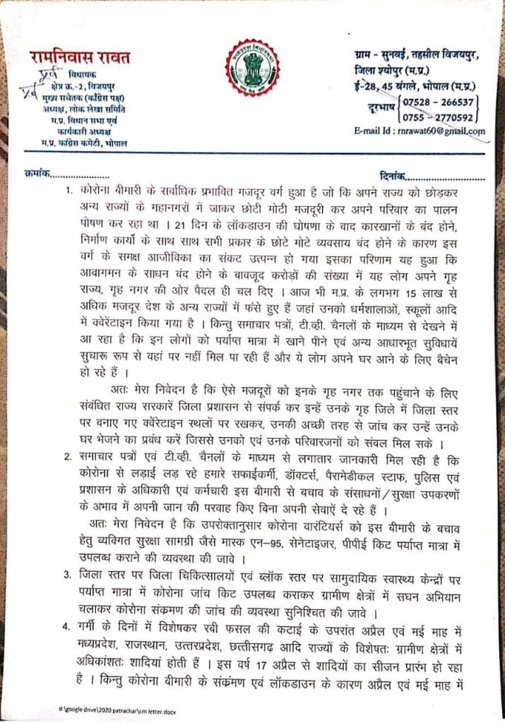 उन्होंने पत्र में मजदूरों का मुद्दा उठाया| पूर्व विधायक ने लिखा कोरोनावायरस के सर्वाधिक प्रभावित मजदूर वर्ग हुआ है जो कि अपने राज्य को छोड़कर अन्य राज्यों के महानगरों में जाकर छोटी मोटी मजदूरी कर अपने परिवार का पालन पोषण कर रहा था लॉक डाउन की घोषणा के बाद कारखानों के बंद होने निर्माण कार्यों के साथ-साथ सभी प्रकार के छोटे-मोटे व्यवसाय बंद होने के कारण उनके समक्ष आजीविका का संकट उत्पन्न हो गया है| करोड़ों की संख्या में लोग अपने गृह राज्य गृह नगर की ओर पैदल ही चल दिए| मध्य प्रदेश के लगभग 15 लाख से अधिक मजदूर देश के अन्य राज्यों में फंसे हुए है| मजदूरों को उनके गृह नगर तक पहुंचाने के लिए राज्य सरकार जिला प्रशासन से संपर्क करें| गृह जिले में जिला स्तर पर बनाए गए क्वॉरेंटाइन स्थलों पर रखकर उनकी अच्छी तरह से जांच कर उन्हें घर भेजने का प्रबंध करे|