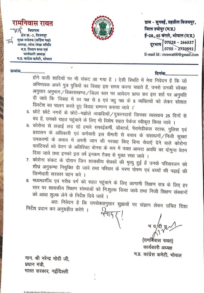 पूर्व विधायक ने लिखा छोटे छोटे नगरों के छोटे मझोले व्यापारी, दुकानदार और जिनका व्यवसाय 25 दिनों से बंद है उनको राहत पहुंचाने के लिए विशेष राहत पैकेज स्वीकृत किया जाए| सफाई कर्मी, डॉक्टर, पैरामेडिकल स्टाफ पुलिस और प्रशासन के अधिकारियों कर्मचारी को अतिरिक्त बोनस के रूप में दोगुना वेतन दिया जाए इस वर्ष इनकम टैक्स से मुक्त रखा जाए|