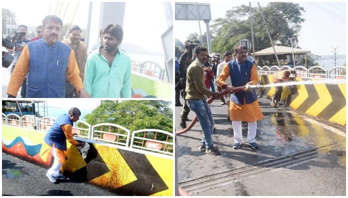 भोपाल। स्वच्छ्ता सर्वेक्षण में भोपाल को नबंर 1 बनाने की कवायद में नगर निगम जी-जान से लगा हुआ है। महापौर से लेकर अधिकारी अमला खुद सड़कों पर उतरकर ना केवल सफाई का जायजा ले रहे हैं। बल्कि खुद सफाई भी कर रहे हैं। आज राजाभोज सेतु ब्रिज पर पहुंचकर महापौर आलोक शर्मा ओर नगर निगम अधिकारियों ने ब्रिज की सफाई की।
