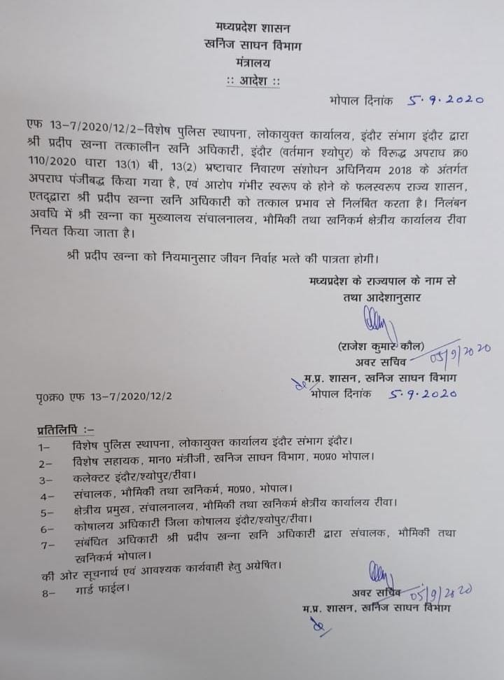 इंदौर जिला खनिज अधिकारी रहे प्रदीप खन्ना को सस्पेंड करने के लिए लोकायुक्त पुलिस ने विभाग के प्रमुख सचिव को पत्र लिखा था। बीते दिनों खनिज विभाग के अधिकारी प्रदीप खन्ना के घर पर लोकायुक्त ने छापा मारा था| लोकायुक्त ने भोपाल के अलावा इंदौर स्थित उसके घर पर छापामार कार्रवाई की थी| आय से अधिक संपत्ति के इस मामले में करोड़ों की संपत्ति का खुलासा हुआ है| खन्ना के खिलाफ बगैर अनुमति खदानों का संचालन, सरकारी जमीनों पर अवैध खनन सहित अन्य मामलों की जांच भी चल रही है|