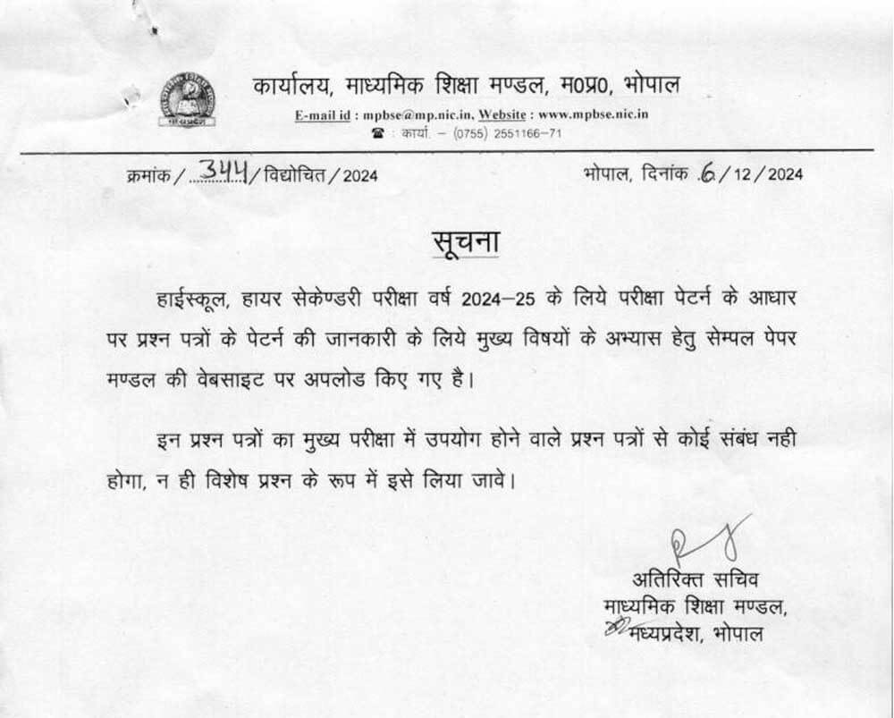 एमपी बोर्ड ने एक सूचना पत्र जारी कर बताया है कि हाईस्कूल, हायर सेकेंडरी परीक्षा वर्ष 2024-25 के लिए परीक्षा पैटर्न के आधार पर प्रश्न पत्रों के पैटर्न की जानकारी के लिए मुख्य विषयों के अभ्यास के लिए सैंपल पेपर मंडल की वेबसाइट पर अपलोड किए गए हैं। इन प्रश्न पत्रों का मुख्य परीक्षा में उपयोग होने वाले प्रश्न पत्रों से कोई संबंध नहीं होगा न ही विशेष प्रश्न के रूप में इसे लिया जाये।