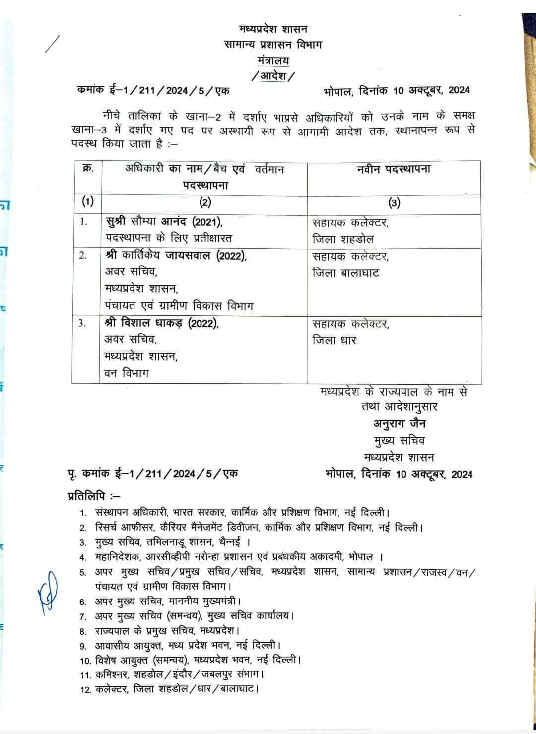 MP GAD द्वारा जारी आदेश में पहला नाम पदस्थापना का इन्तजार कर रहीं 2021 बैच की IAS अधिकारी सौम्या आनंद का है उन्हें शहडोल का सहायक कलेक्टर बनाया गया है , दूसरा नाम पंचायत एवं ग्रामीण विकास विभाग के अवर सचिव 2022 बैच के अधिकारी कार्तिकेय जायसवाल का है उन्हें बालाघाट का सहायक कलेक्टर बनाया गया है वहीं तीसरा नाम वन विभाग के अवर सचिव 2022 बैच के अधिकारी विशाल धाकड़ का है जिन्हें धार जिले का सहायक कलेक्टर बनाया गया है।