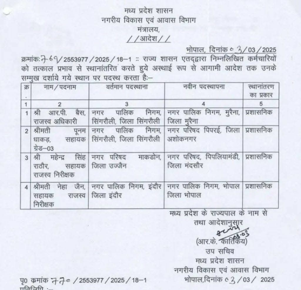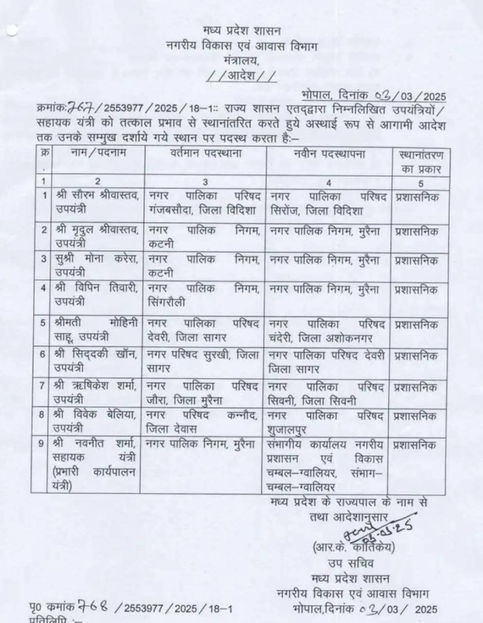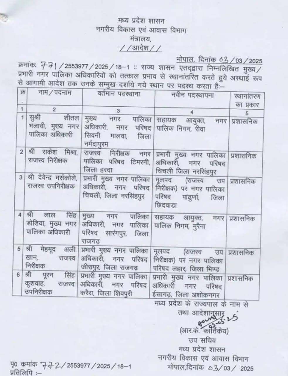 शासन ने इन अधिकारियों को एक जिले से दूसरे जिले में पदस्थ किया है, नगरीय विकास एवं आवास विभाग ने 19 अधिकारियों कर्मचारियों को तबादले किये हैं जिन्हें निश्चित समय सीमा में नई पदस्थापना वाली जगह ज्वाइन करना है और शासन को सूचित करना है।