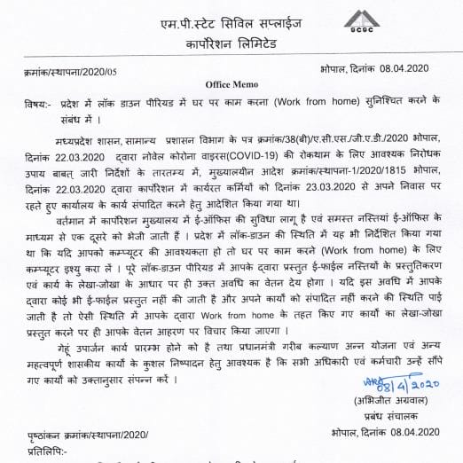 भोपाल| मध्य प्रदेश में जहाँ मुख्यमंत्री शिवराज सिंह कोरोना के खिलाफ अकेले मोर्चे पर डटे हैं और कोरोना से बचाव का हर सम्भव प्रयास कर रहे हैं। वहीं प्रदेश के कुछ आई ए एस अधिकारी कोरोना काल में नए नए प्रयोग कर रहे हैं। मध्यप्रदेश राज्य नागरिक आपूर्ति निगम लिमिटेड के प्रबन्ध संचालक इस काल में अपने कर्मचारियों को घर से काम करने के साथ साथ कंप्यूटर पर काम करना सीखने की हिदायत दे रहे हैं।