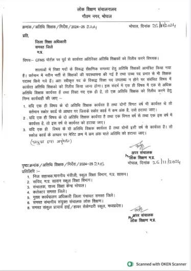 लोक शिक्षण संचालनालय से जारी किये गए पत्र में कहा गया है कि प्रदेश के स्कूलो में रिक्त पदों से होने वाली शैक्षणिक समस्या हेतु अतिथि शिक्षकों आमंत्रित किया गया है। वर्तमान में नवीन भर्ती से शिक्षकों की पदस्थापना की गई है तथा उन पद प्रभार से भी शिक्षक पदस्थ किये गये हैं। अतः स्वीकृत पद के विरुद्ध रिक्त पद उपलब्ध न होने पर संबंधित विषय में कार्यरत अतिथि शिक्षको को रिलीव किया जाना होगा। इसलिए एक ही विषय में एक से अधिक अतिथि शिक्षक कार्यरत है तथा रिक्त पद एक ही है तो एक अतिथि शिक्षक को रिलीव किया जाए।