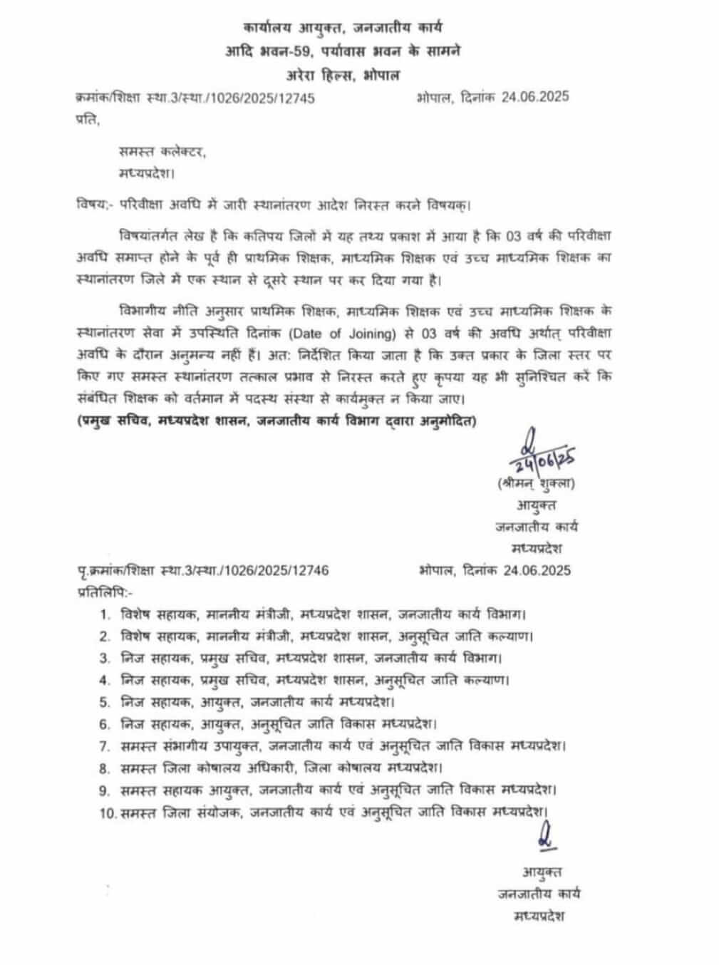 मध्य प्रदेश में हाल ही हुए तबादलों के बाद उसमें गड़बड़ियों की बातें भी सामने आ रही हैं, जिसके बाद संशोधन आदेश जारी किये जा रहे हैं, प्रदेश के जनजातीय कार्य विभाग ने नियमों का बड़ा उल्लंघन सामने आने के बाद आदेश जारी करते हुए प्राथमिक शिक्षक, माध्यमिक शिक्षक और उच्च माध्यमिक शिक्षकों के तबादले निरस्त कर दिए हैं, ये वो शिक्षक हैं जिनकी परिवीक्षा अवधि (probation period) पूरी नहीं हुई थी।