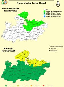 गुना, उज्जैन, आगर-मालवा और शाजापुर में हुई ओलावृष्टि से फसलों बर्बाद हो गई। बुधवार (28 जनवरी 2026) सुबह भोपाल, इंदौर, उज्जैन, रायसेन, सीहोर, ग्वालियर, शिवपुरी, भिंड, दतिया, निवाड़ी, टीकमगढ़, छतरपुर, पन्ना, सतना, श्योपुर, टीकमगढ़, मुरैना, मैहर और रीवा में सुबह-सुबह हल्के से मध्यम कोहरा छाया रहा। बारिश व ठंड के चलते बुधवार को ग्वालियर के सभी सरकारी व निजी स्कूलों में कक्षा 8वीं तक के स्कूलों में अवकाश घोषित कर दिया गया है।