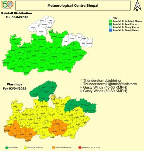 - 4 अप्रैल (शनिवार): भोपाल, विदिशा, रायसेन, नर्मदापुरम, हरदा, बुरहानपुर, खंडवा, शाजापुर, गुना, अशोकनगर, शिवपुरी, ग्वालियर, दतिया, भिंड, मुरैना, श्योपुरकलां, टीकमगढ़, निवाड़ी, सीहोर, राजगढ़, बैतूल, खरगौन, बड़वानी, धार, इंदौर, उज्जैन, देवास, आगर, रीवा, सतना, उमरिया, कटनी, जबलपुर, नरसिंहपुर, छिंदवाड़ा, सिवनी, बालाघाट, पन्ना, दमोह, सागर, छतरपुर, मैहर, पांढुर्णा में कहीं-कहीं में झंझावत, वज्रपात, झोंकेदार हवाएं 30 से 50 किमी प्रति घंटा की रफ्तार और ओलावृष्टि।