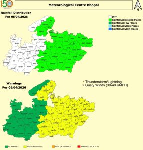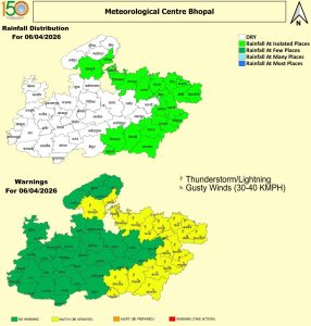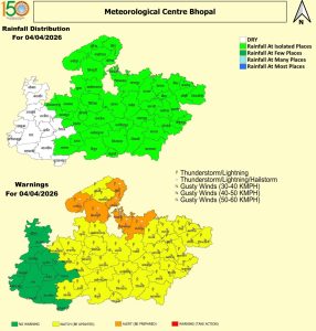 - 6 अप्रैल (सोमवार): बारिश की गतिविधियों में तेजी आएगी और ग्वालियर-भोपाल समेत कई जिलों में बारिश, आंधी और ओले गिरने की संभावना है।