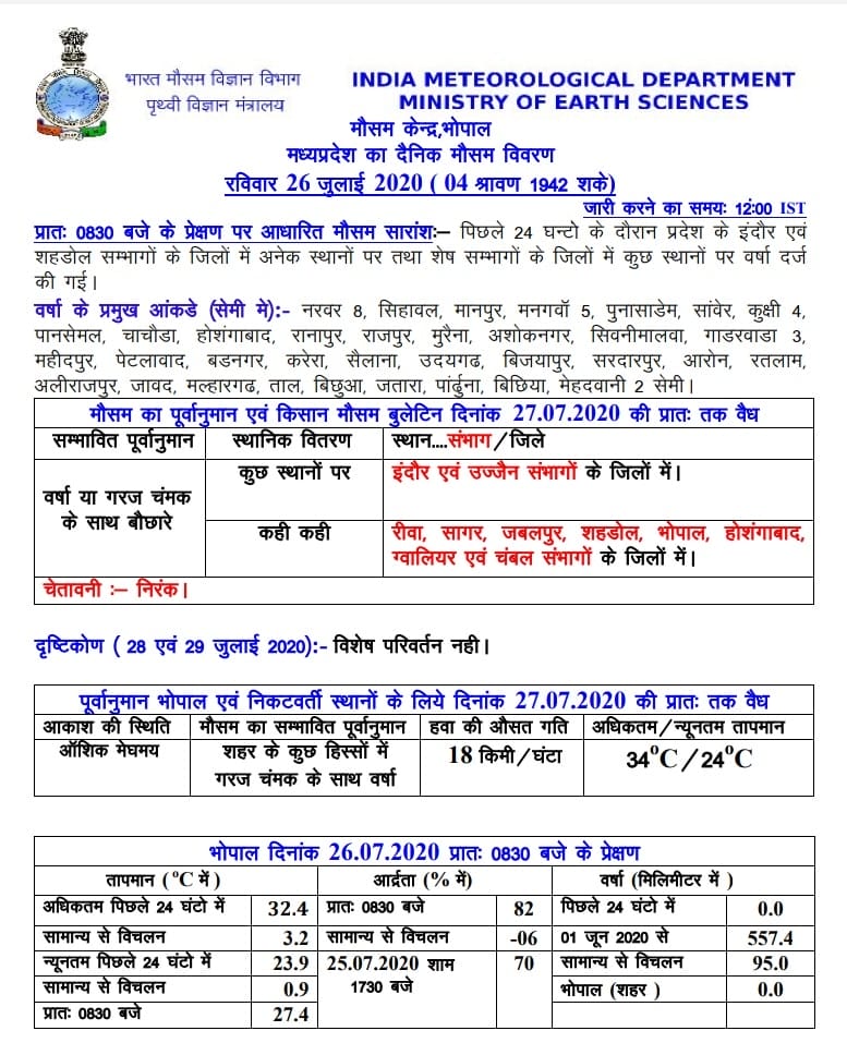 मौसम विभाग की माने तो इंदौर, उज्जैन, रीवा, जबलपुर, होशंगाबाद, सागर,शहडोल, ग्वालियर, चंबल संभागों में गरज चमक के साथ कही कही बारिश की संभावना है।18 किमी/घंटा की रफ्तार से हवा चलने की संभावना है।पिछले चौबीस घंटे में रतलाम में 19, होशंगाबाद में 18, सीधी में 14, उमरिया में 11, मंडला में 9, ग्वालियर में 7.6, छिंदवाड़ा में 5, खरगोन में 4, इंदौर में 1.6, जबलपुर में 0.4 मिमी. बारिश हुई।