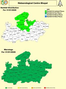 - 31 जनवरी (शनिवार): ग्वालियर, मुरैना, दतिया, भिंड, श्योपुर, शिवपुरी, अशोकनगर, गुना, विदिशा, सागर, निवाड़ी, टीकमगढ़, छतरपुर।