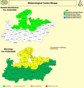 पश्चिमी विक्षोभ के असर से मंगलवार ( 3 फरवरी 2026) को 20 जिलों में मावठा गिरने का अलर्ट जारी किया गया है। बुधवार से फिर प्रदेश के कई जिलों में मध्यम से घना कोहरा छाने की संभावना जताई गई है। सोमवार ( 2 फरवरी 2026) को भोपाल, उज्जैन, ग्वालियर, चंबल, रीवा, सागर और जबलपुर संभाग के कई जिलों में बादल छाए रहे और कहीं-कहीं बारिश हुई। सबसे कम न्यूनतम तापमान 8.4°C पचमढ़ी (नर्मदापुरम) में दर्ज किया गया। सर्वाधिक अधिकतम तापमान 30.2°C खरगोन में दर्ज हुआ।