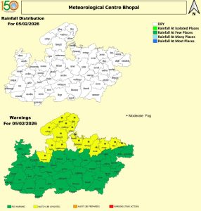 - 5 फरवरी (गुरुवार): राजगढ़, गुना, अशोकनगर, शिवपुरी, ग्वालियर, दतिया, भिंड, मुरैना, श्योपुर, रीवा, मऊगंज, सतना, पन्ना, छतरपुर, टीकमगढ़ और निवाड़ी।