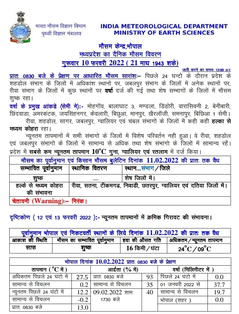 भोपाल, डेस्क रिपोर्ट। पाकिस्तान और उससे सटे उत्तर भारत के क्षेत्रों में पश्चिमी विक्षोभ के प्रभावी होने का असर मध्य प्रदेश के मौसम (MP Weather Update Today 10 February 2022) पर भी पड़ रहा है जिसके चलते मौसम के मिजाज लगातार बदल रहे हैं। प्रदेश के कुछ जिलों में हलकी बारिश का दौर भी जारी है लेकिन अधिकांश जिलों में मौसम शुष्क बना हुआ है। एमपी मौसम विभाग (MP Weather Department) ने अगले चौबीस घंटों में प्रदेश के कुछ जिलों में माध्यम से घना कोहरा छाने का अलर्ट जारी किया है।