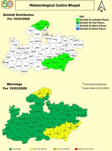 - 15 मार्च: ग्वालियर, मुरैना, भिंड, छिंदवाड़ा, सिवनी, मंडला, डिंडौरी और बालाघाट में हल्की बारिश व आंधी।