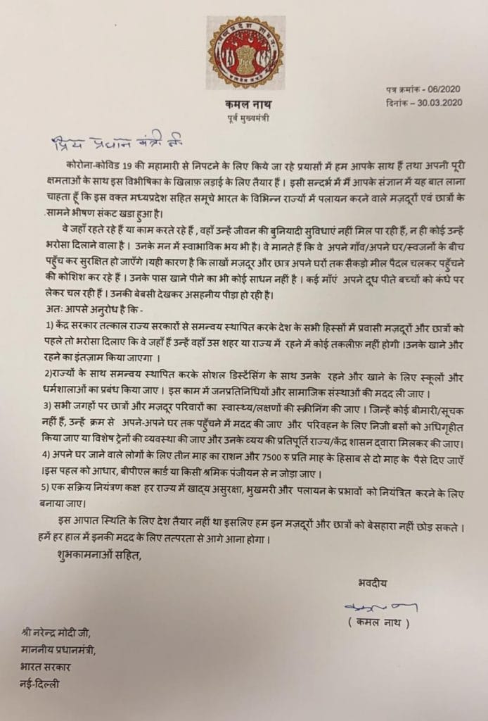 अपने लिखे पत्र में पूर्व मुख्यमंत्री कमलनाथ ने प्रधानमंत्री मोदी से कहा है कि कोरोना की महामारी से निपटने के लिए वह सरकार के साथ हैं किंतु विभिन्न राज्य से पलायन करने वाले मजदूरों एवं छात्रों के सामने इस वक्त भीषण संकट खड़ा हो चुका है। जिससे जहां वह रह रहे हैं उन राज्यों में उन्हें बुनियादी सुविधाएं नहीं मिल पा रही है। जिसकी वजह से लाखों मजदूर और छात्र अपने घरों तक सैकड़ों मील पैदल चलकर पहुंच रहे हैं। उनके पास खाने-पीने के कोई साधन नहीं है। इसलिए उन्होंने पीएम मोदी से अपील की है कि केंद्र सरकार तत्काल राज्य सरकारों से समन्वय स्थापित कर देश के विभिन्न हिस्सों में प्रवासी मजदूरों एवं छात्रों के लिए खाने एवं रहने की तत्काल व्यवस्था करें। वहीं पूर्व मुख्यमंत्री ने कहा है कि राज्यों के साथ समन्वय स्थापित करके सोशल डिस्टेंसिंग के साथ रहने व खाने का प्रबंध किया जाए और इस काम में सामाजिक संस्थाओं की मदद ली जाए। पीएम मोदी से अनुरोध करते हुए पूर्व मुख्यमंत्री ने कहा कि सभी जगह पर छात्र एवं मजदूर परिवारों का स्वास्थ्य स्क्रीनिंग की जाए और जिन्हें कोई बीमारी नहीं है उन्हें अपने-अपने घर तक पहुंचने में मदद की जाए। विशेष ट्रेन के जरिए लोगों को उनके घर तक पहुंचाया जाए जिसके व्यय की प्रतिपूर्ति राज्य एवं केंद्र सरकार मिलकर करें। और साथ ही अपने घर जाने वाले लोगों के लिए 3 माह का राशन और 7500 रुपए प्रति माह के हिसाब से 2 माह की आर्थिक मदद की जाए। वहीं एक सक्रिय नियंत्रण केंद्र की व्यवस्था हर राज्य में खाद्य सुरक्षा, भुखमरी और पलायन के प्रभावों को नियंत्रित करने के लिए भी की जाए। पूर्व मुख्यमंत्री ने कहा है कि देश इस आपातकाल से लड़ने के लिए तैयार नहीं था किंतु हम मजदूरों एवं बेसहारा छात्रों को ऐसे नहीं छोड़ सकते। हमें इनकी मदद के लिए आगे आना होगा।