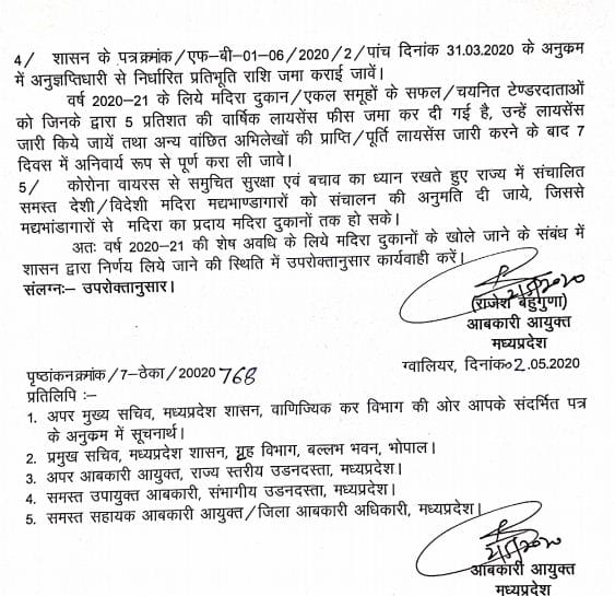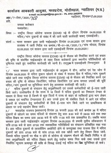 कार्यालय आबकारी आयुक्त ने सभी कलेक्टरों को आदेश जारी कर शराब और भांग की दुकानों को लेकर दिशा निर्देश जारी कर दिए हैं| शराब दुकानों के सञ्चालन के लिए अनुज्ञप्तिधारी और उसके कर्मचारियों के लिए ई-पास जारी किये जाएंगे| आदेश में कहा गया है कि भारत सरकार द्वारा लॉकडाउन-3 के लिए जारी गाइडलाइन के अनुसार सुबह 7 बजे से शाम 7 बजे तक व्यावसायिक गतिविधियों को प्रतिबंधित किया है| इसलिए मदिरा दुकानों के लाइसेंस अथॉरिटी होने से जनसुरक्षा तथा राजस्व हित में मदिरा दूकान सुबह 7 बजे से शाम 7 बजे तक खोलने पर विचार करे| ताकि कोरोना के संक्रमण के फैलाव की स्तिथि न बने| दुकान संचालक को केंद्र सरकार द्वारा जारी निर्देश का पालन करना होगा|