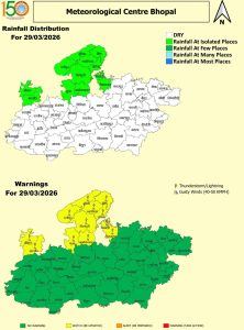 - 29 मार्च (रविवार): ग्वालियर, श्योपुर, मुरैना, भिंड, दतिया, निवाड़ी, टीकमगढ़, शिवपुरी, गुना, अशोकनगर, नीमच और मंदसौर में हल्की से मध्यम बारिश।