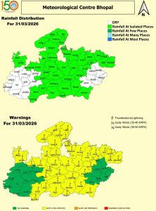 - 31 मार्च (मंगलवार): भोपाल, ग्वालियर, जबलपुर, श्योपुर, मुरैना, भिंड, दतिया, शिवपुरी, गुना, अशोकनगर, नीमच, मंदसौर, आगर-मालवा, राजगढ़, विदिशा, सीहोर, हरदा, खंडवा, बुरहानपुर, बैतूल, नर्मदापुरम, रायसेन, सागर, नरसिंहपुर, छिंदवाड़ा, पांढुर्णा, बालाघाट, सिवनी, दमोह, कटनी, निवाड़ी, टीकमगढ़, छतरपुर, पन्ना, सतना, मैहर, रीवा, मऊगंज, सीधी और सिंगरौली जिलों में गरज चमक के साथ बारिश हो सकती है।