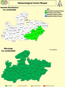मौसम विभाग ने 23-24 फरवरी को फिर बारिश का अलर्ट जारी किया है। फिलहाल 2-3 दिन बादल छाए रहेंगे और कहीं-कहीं बूंदाबांदी हो सकती है। आज शुक्रवार को राजधानी भोपाल, इंदौर, ग्वालियर, जबलपुर, दतिया, भिंड, मुरैना और शिवपुरी में बादल छाए रहने का अनुमान है। इस दौरान कहीं-कहीं बूंदाबांदी भी हो सकती है। ग्वालियर, सागर, रीवा में 30 से 40 किलोमीटर प्रति घंटे की रफ्तार से हवाएं चलने की संभावना है।
