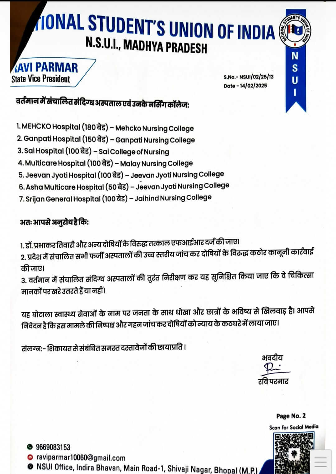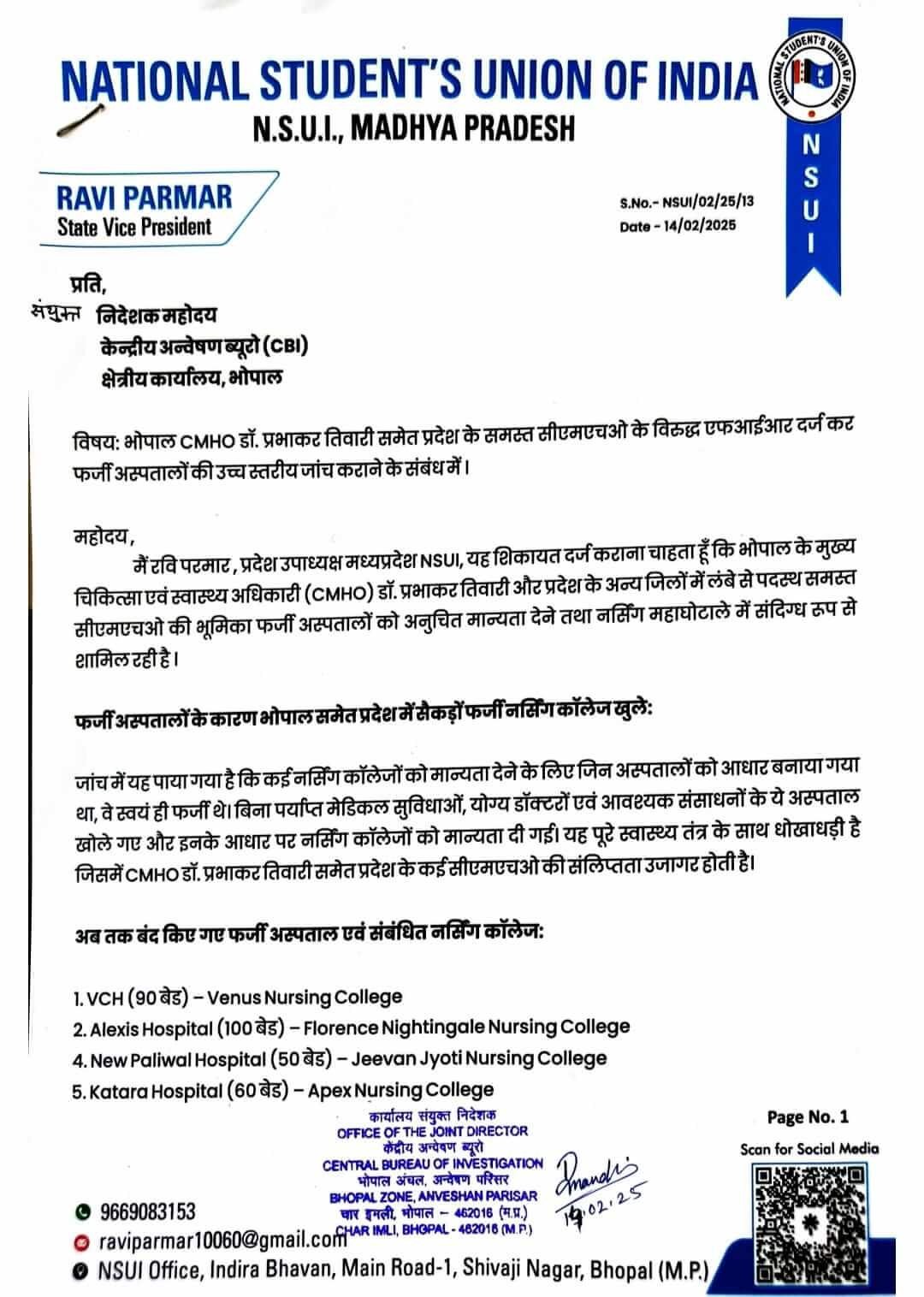 NSUI प्रदेश उपाध्यक्ष रवि परमार ने सीबीआई निदेशक भोपाल को एक पत्र लिखा है जिसमें उन्होंने कहा – मैं यह शिकायत दर्ज कराना चाहता हूँ कि भोपाल के मुख्य चिकित्सा एवं स्वास्थ्य अधिकारी (CMHO) डॉ. प्रभाकर तिवारी और प्रदेश के अन्य जिलों में लंबे से पदस्थ समस्त सीएमएचओ की भूमिका फर्जी अस्पतालों को अनुचित मान्यता देने तथा नर्सिंग महाघोटाले में संदिग्ध रूप से शामिल रही है।