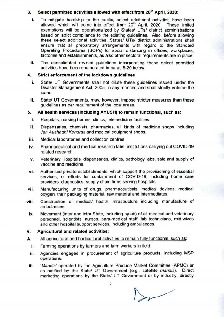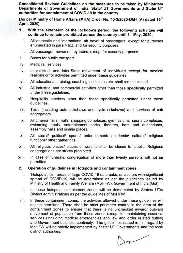 लॉक डाउन की गाइडलाइन में खेती से जुड़े सभी कामों को छूट गई है। स्कूल कॉलेज पहले की तरह बंद रहेंगे। मंदिर और अन्य धार्मिक स्थल भी 3 मई तक नहीं खोले जा सकेंगे। गृह मंत्रालय की ओर से आज जारी गाइडलाइन के मुताबिक, प्लेन, मेट्रो या बस नहीं चलेंगी| वहीं पहले से जिन्हें छूट मिली है, वह जारी रहेगी| कृषि से जुड़े कामों के लिए रियायत दी जाएगी| वहीं, औद्योगिक गतिविधियों पर रोक जारी रहेगी| सभी तरह के परिवहन सेवाओं पर रोक रहेगी|