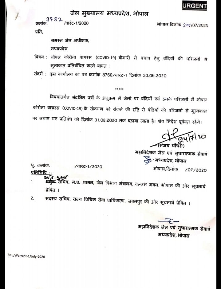 इस पत्र में कहा गया है कि कोविड 19 के बचाव के लिए जेलों में कैद बंदियों और उनके परिजनों की सुरक्षा की दृष्टि से बंदियों की परिजनों से मुलाकात पर रोक 31 अगस्त 2020 तक बढ़ाई जाती है। ये आदेश प्रदेश के समस्त जेल अधीक्षकों को भेज दिया गया है और तत्काल प्रभाव से लागू कर दिया गया है।