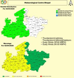 2 अप्रैल (गुरुवार): भोपाल, विदिशा, रायसेन, सीहोर, राजगढ़, नर्मदापुरम, हरदा, अलीराजपुर, देवास, शाजापुर, आगर, बैतूल, बुरहानपुर, खंडवा, खरगौन, इंदौर, रतलाम, उज्जैन, मंदसौर, नीमच, गुना, अशोकनगर, शिवपुरी, ग्वालियर, मुरैना, श्योपुरकलां, छिंदवाड़ा, पांढुर्णा, बड़वानी, झाबुआ, धार में कहीं-कहीं बारिश, वज्रपात, झोंकेदार हवाएं 30 से 50 किमी प्रति घंटा की रफ्तार और ओलावृष्टि।