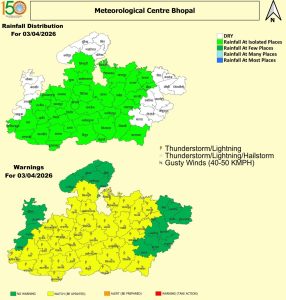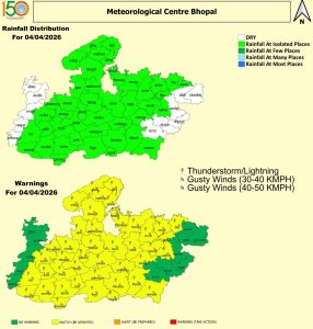 4 अप्रैल (शनिवार): भोपाल, विदिशा, रायसेन, नर्मदापुरम, हरदा, बुरहानपुर, खंडवा, शाजापुर, गुना, अशोकनगर, शिवपुरी, ग्वालियर, दतिया, भिंड, मुरैना, श्योपुरकलां, टीकमगढ़, निवाड़ी, सीहोर, राजगढ़, बैतूल, खरगौन, बड़वानी, धार, इंदौर, उज्जैन, देवास, आगर, रीवा, सतना, उमरिया, कटनी, जबलपुर, नरसिंहपुर, छिंदवाड़ा, सिवनी, बालाघाट, पन्ना, दमोह, सागर, छतरपुर, मैहर, पांढुर्णा में कहीं-कहीं में झंझावत, वज्रपात, झोंकेदार हवाएं 30 से 50 किमी प्रति घंटा की रफ्तार और ओलावृष्टि।