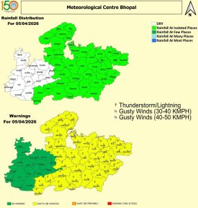 5 अप्रैल (रविवार): विदिशा, रायसेन, नर्मदापुरम, बैतूल, गुना, अशोकनगर, शिवपुरी, ग्वालियर, दतिया, भिंड, मुरैना, श्योपुरकलां, सिंगरौली, सीधी, रीवा, मऊगंज, सतना, अनुपपुर, शहडोल, उमरिया, डिंडोरी, कटनी, जबलपुर, नरसिंहपुर, छिंदवाड़ा, सिवनी, मंडला, बालाघाट, पन्ना, दमोह, सागर, छतरपुर, टीकमगढ़, निवाड़ी, मैहर, पांढुर्णा, हरदा, बुरहानपुर, खंडवा में कहीं-कहीं में झंझावत, वज्रपात, झोंकेदार हवाएं 30 से 50 किमी प्रति घंटा की रफ्तार और ओलावृष्टि।