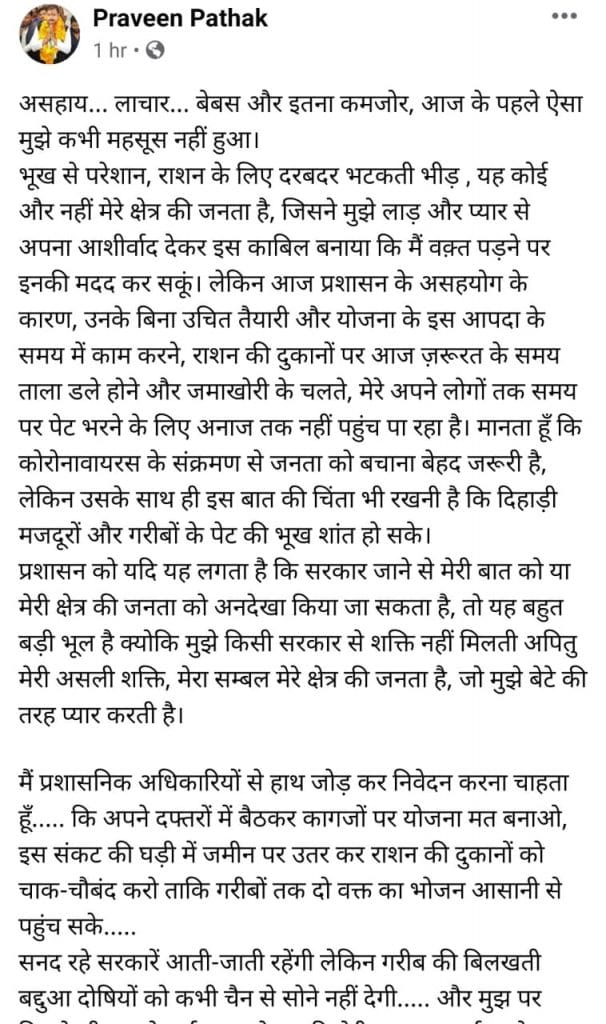 “असहाय… लाचार… बेबस और इतना कमजोर, आज के पहले ऐसा मुझे कभी महसूस नहीं हुआ, भूख से परेशान, राशन के लिए दरबदर भटकती भीड़ , यह कोई और नहीं मेरे क्षेत्र की जनता है, जिसने मुझे लाड़ और प्यार से अपना आशीर्वाद देकर इस काबिल बनाया कि मैं वक़्त पड़ने पर इनकी मदद कर सकूं। लेकिन आज प्रशासन के असहयोग के कारण, उनके बिना उचित तैयारी और योजना के इस आपदा के समय में काम करने, राशन की दुकानों पर आज ज़रूरत के समय ताला डले होने और जमाखोरी के चलते, मेरे अपने लोगों तक समय पर पेट भरने के लिए अनाज तक नहीं पहुंच पा रहा है। मानता हूँ कि कोरोनावायरस के संक्रमण से जनता को बचाना बेहद जरूरी है, लेकिन उसके साथ ही इस बात की चिंता भी रखनी है कि दिहाड़ी मजदूरों और गरीबों के पेट की भूख शांत हो सके।