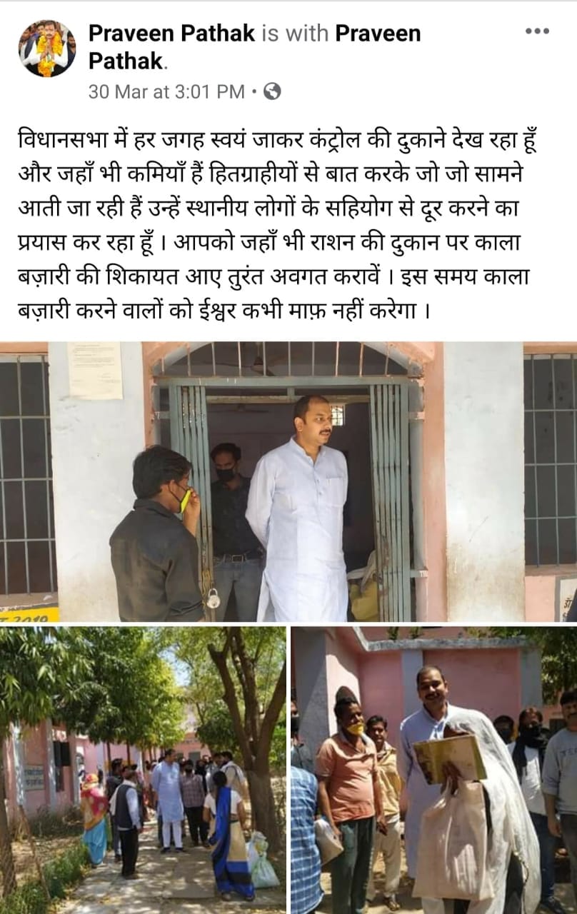 ग्वालियर जिले की छह विधानसभा सीटों में ग्वालियर दक्षिण विधानसभा क्षेत्र के कांग्रेस विधायक प्रवीण पाठक ऐसे जनप्रतिनिधि हैं जो खुद को जनता के बीच रहना पसंद करते हैं। क्षेत्र की जनता की बुनियादी सुविधाओं के लिए वे हमेशा अधिकारियों को चेतावनी देते दिखाई देते हैं। कांग्रेस सरकार के 15 महीने के कार्यकाल में विधायक पाठक जिले के सबसे सक्रिय विधायक माने जाते हैं। आज जहाँ हालात विषम है और लॉक डाउन के चलते लोग घरों में हैं इस स्थिति में भी विधायक पाठक को जनता के फिक्र है। खुद को होम कवारेंटाइन में रखने के बावजूद विधायक पाठक अपने क्षेत्र की गरीब जनता के लिए अनाज की व्यवस्था करने के लिए सुबह सुबह राशन की दुकानों के निरीक्षण के लिए निकलते हैं उन्होंने अपने फेसबुक पेज पर कहा है कि कोई कालाबाजारी नहीं करे और कोई ऐसा करता है तो मुझे शिकायत की जाए।उधर राशन दुकानों पर राशन की कमी और जनता की परेशानी देखकर विधायक पाठक बहुत परेशान हैं उन्होंने अपना दर्द फेसबुक पर साझा किया है। विधायक पाठक ने लिखा…