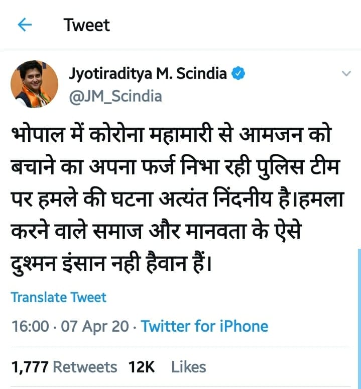 ज्योतिरादित्य सिंधिया ने ट्वीट कर भोपाल में पुलिसकर्मियों पर हुए हमले की निंदा की है। उन्होने लिखा है कि पुलिसकर्मी इस महामारी में अपना फर्ज निभा रहे हैं और ऐसे में इनपर हमता मानवता और समाज पर हमला है। ऐसे लोग इंसान नहीं हैवान हैं।