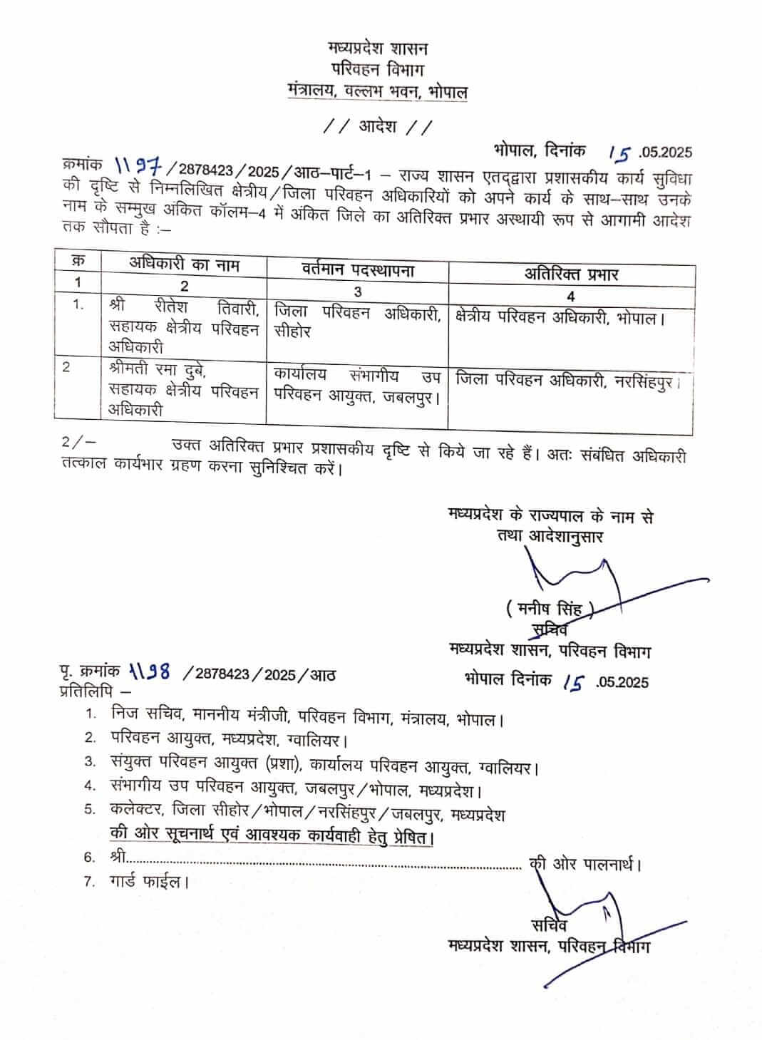 सीहोर जिला परिवहन अधिकारी को भोपाल का अतिरिक्त प्रभार
