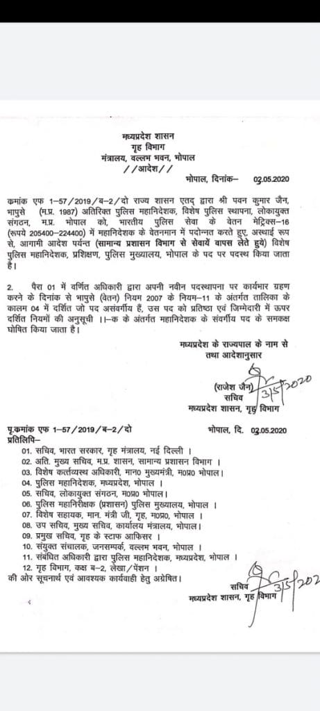 आदेश के मुताबिक, आईपीएस पवन जैन अतिरिक्त पुलिस महानिदेशक, विशेष पुलिस स्थापना लोकायुक्त संगठन मप्र को भारतीय पुलिस सेवा के वेतन मैट्रिक्स-16 (रुपए 205400-224400) में महानिदेशक के वेतनमान में पदौन्नत करते हुए विशेष पुलिस महानिदेशक, प्रशिक्षण, पुलिस मुख्यालय, भोपाल के पद पर पदस्थ किया गया है|